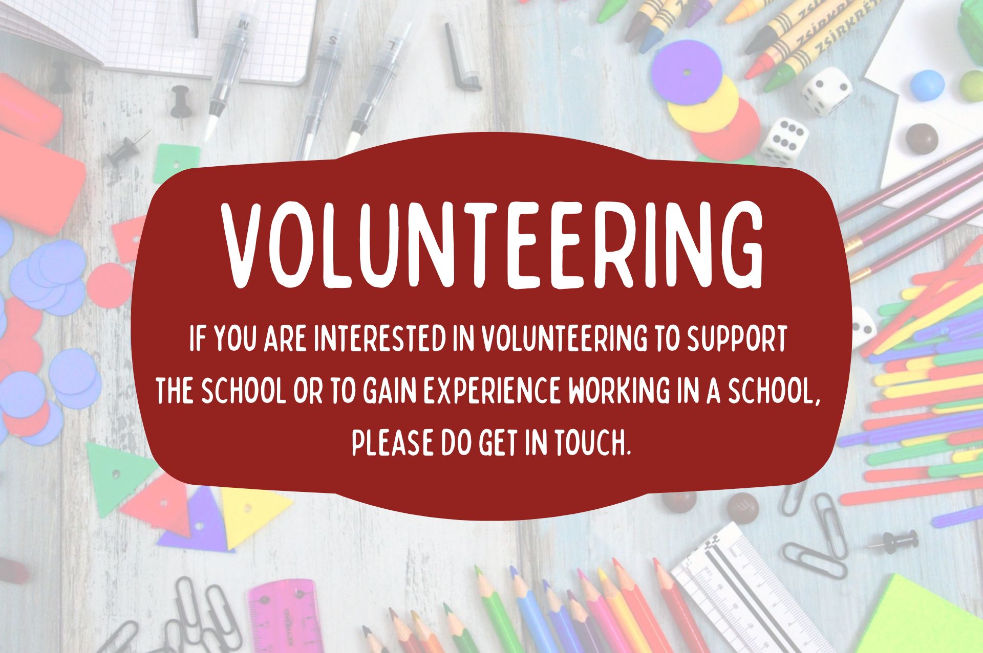 We will always be looking for ways to improve our organisation in all areas.  If you are interested in volunteering to support the school or to gain experience working in a school, please do get in touch with the school office via email using: office@stjohnsfirstschool.org